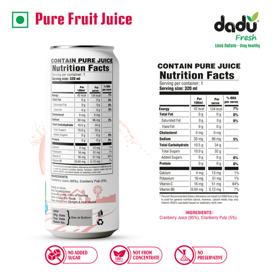 Dadu Fresh Cranberry Juice | Pure Natural Fruit Healthy Beverage | Not from Concentrate, No Added Sugar, No Preservatives or Artificial Flavours | Vitamin Rich & Naturally Refreshing | 6 Cans x 320ml (1920ml)