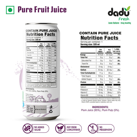 Dadu Fresh Plum Juice | Pure Natural Fruit Healthy Beverage | Not from Concentrate, No Added Sugar, No Preservatives or Artificial Flavours | Vitamin Rich & Naturally Refreshing | 6 Cans x 320ml (1920ml)