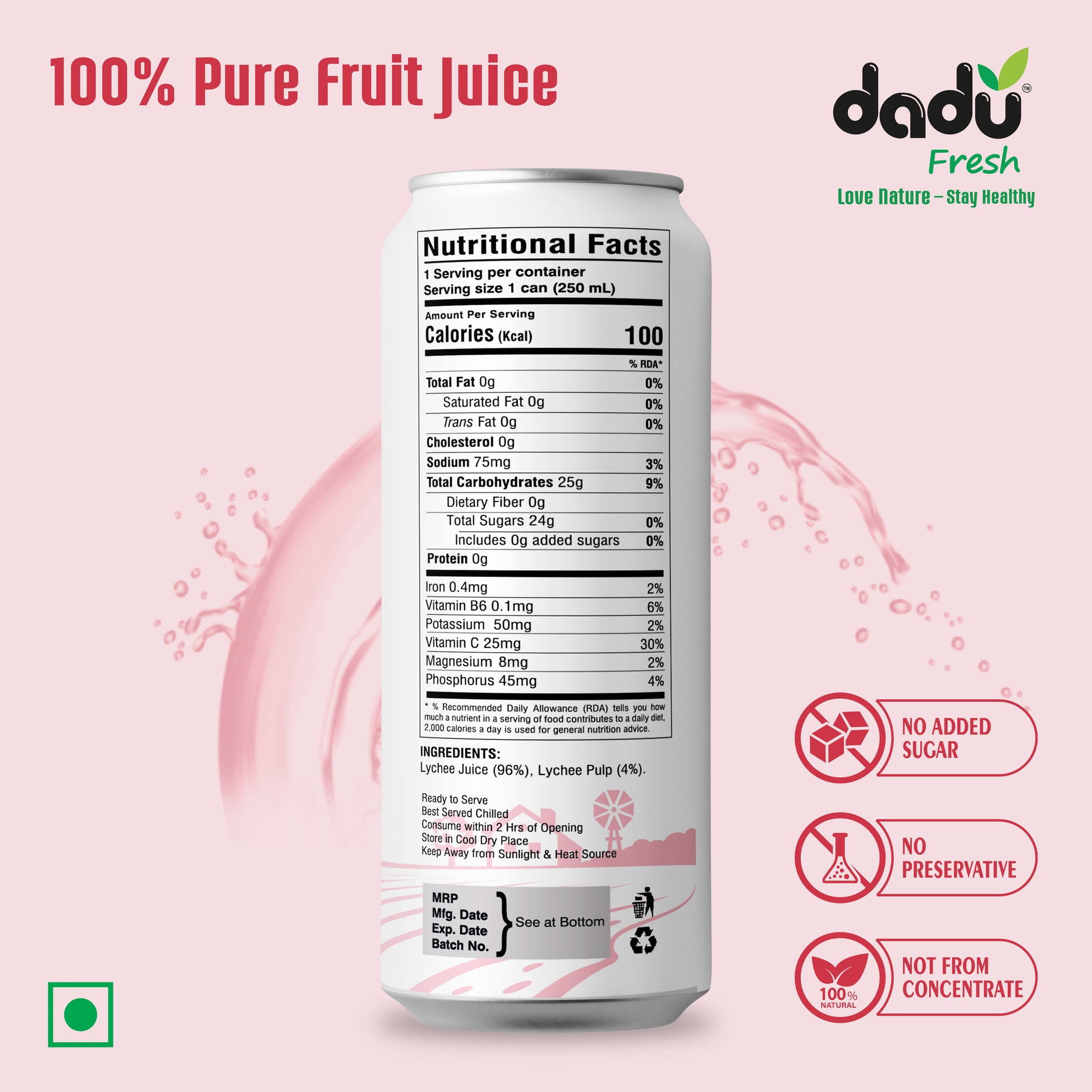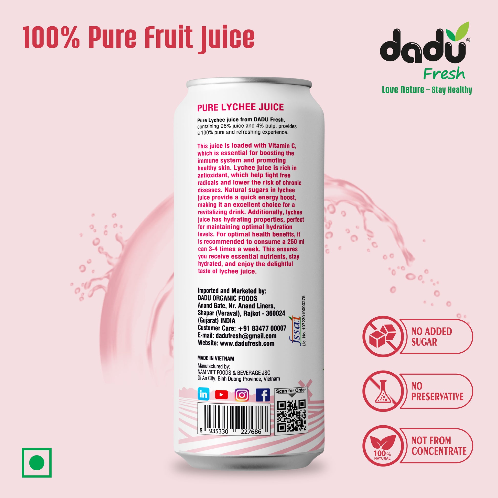 Discover the refreshing taste of Dadu Fresh Lychee Juice, crafted from 100% natural lychees. Each bottle contains 96% pure lychee juice and 4% lychee pulp, with no added sugar, no preservatives, and no concentrate—only real fruit goodness. Rich in Vitamin C (30% RDA), potassium, magnesium, and antioxidants, our lychee juice supports hydration, boosts immunity, and promotes overall wellness. Light, refreshing, and naturally sweet, it’s the perfect healthy drink for your daily routine. Serve chilled and enjoy the pure, fruity taste of Dadu Fresh Lychee Juice today!
