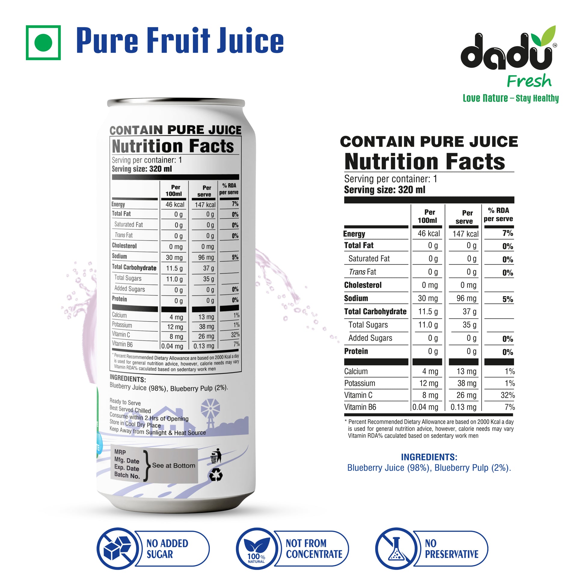 Dadu Fresh Blueberry Juice | Pure Natural Fruit Healthy Beverage | Not from Concentrate, No Added Sugar, No Preservatives or Artificial Flavours | Vitamin Rich & Naturally Refreshing | 6 Cans x 320ml (1920ml)